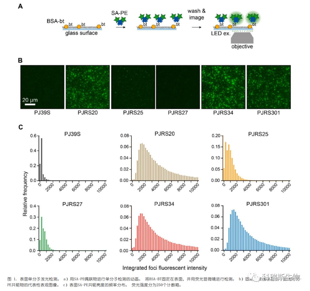 First, biotinylated bovine serum albumin (BSA-bt) was deposited on the glass surface before passivation. Then, SA-PE conjugates were added separately to detect the immobilized BSA (Figure 1a). Individual SA-PE conjugates could be resolved on the glass surface (Figure 1b). It was concluded that these SA-PE conjugates successfully provided distinguishable single-molecule signals.