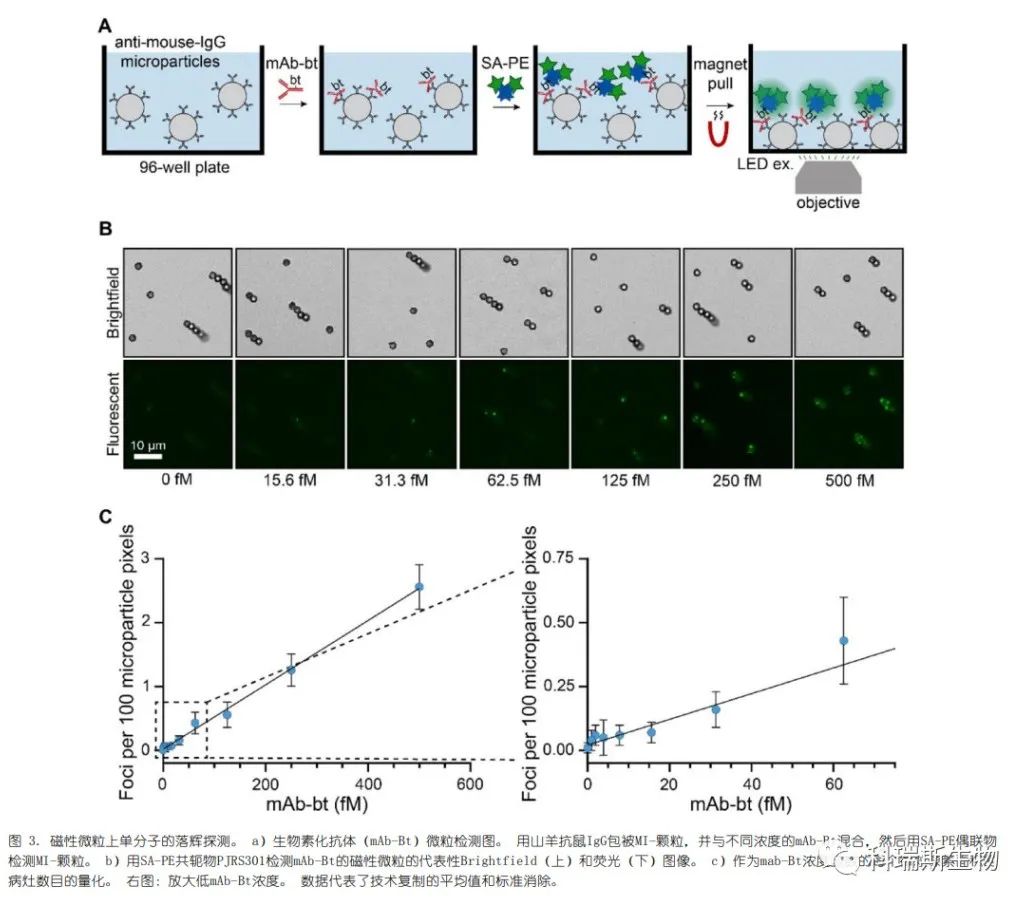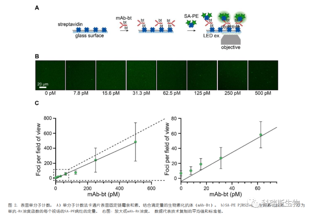 To test whether the known quantity of an analyte on the glass surface could be enumerated, the authors developed a single-molecule counting assay (Figure 2a). SA-PE (PJRS27), which exhibits lower background surface binding despite not being as bright as other conjugates (Figures S2a and b), was selected. Streptavidin was incubated in 96-well plates to adhere non-specifically to the surface. Biotinylated mouse monoclonal antibodies (mAb-bt) were used as the analyte. Measurements of mAb-bt were performed at an initial concentration of 500 pM, followed by two-fold serial dilutions down to 7.8 pM (Figure 2b). A linear correlation was observed between the number of foci and the concentration of the mAb-bt analyte (Figure 2c). The limited non-specific background binding enabled the SA-PE conjugates to achieve a sensitivity of less than 20 pM, demonstrating that SA-PE can be used for the detection and quantification of surface-bound analytes.