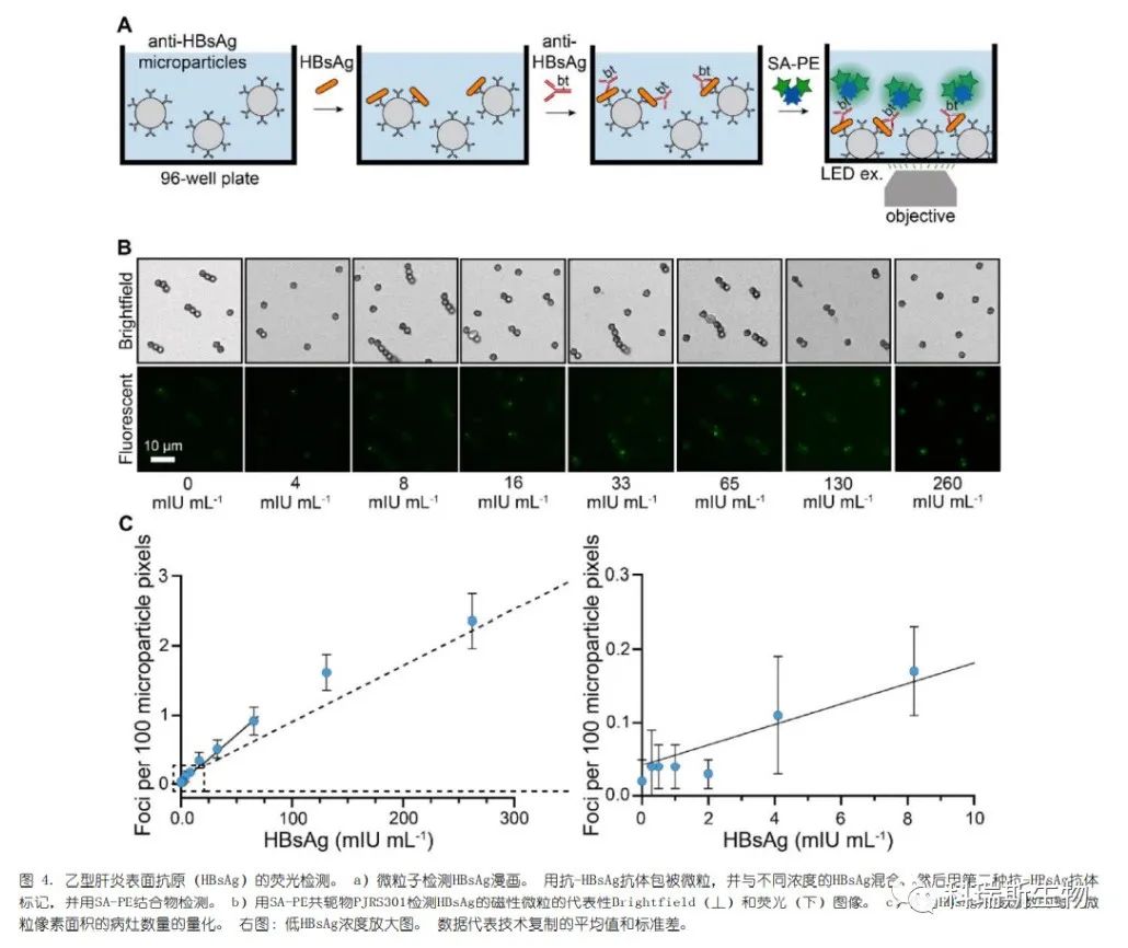 The three bright SA-PE conjugates selected in the preliminary screening were used to test their non-specific binding to microparticles. PJRS20 exhibited significant non-specific binding, while PJRS301 showed better performance and was thus selected for analyte detection (Figure S4). Once again, we could clearly resolve individual foci on the microparticles, and these microparticles displayed a dose response to the dilution of hepatitis B surface antigen (HBsAg) (Figure 4b). This digital assay showed a lower limit of sensitivity for HBsAg of 4.1 mIU mL?1, representing an approximately 5-fold increase in sensitivity compared to commercial chemiluminescence assays (Figure 4c). Therefore, this demonstrates that commercial SA-PE conjugates can be used for the sensitive detection of clinically relevant analytes.