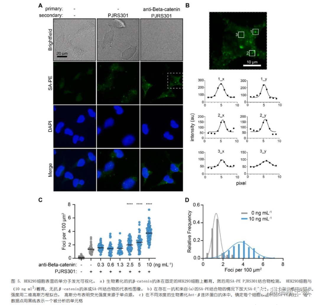 Single foci were selected and fitted with a Gaussian function to confirm they were single-point sources (Figure 5B). Control experiments without primary antibodies still showed visible and quantifiable foci, indicating non-specific adsorption of SA-PE on the cell surface. In the presence of 10 ng mL−1 primary antibody and SA-PE, there was an average of 3.8 foci per 100 μm2, compared to 1.4 foci per 100 μm2 with SA-PE alone (Figure 5C). On fixed cells without SA-PE, only 0.1 foci per 100 μm2 were detected. When the primary antibody concentration exceeded 10 ng/mL, it caused fluorescence overlap of foci and a reduction in distinguishable foci.