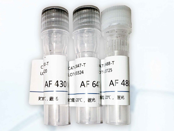 AF NHS esters are typically dissolved in high-quality anhydrous dimethylformamide (DMF) or dimethyl sulfoxide (DMSO) (D12345), and the reaction is carried out at room temperature in 0.1–0.2 M sodium bicarbonate buffer (pH 8.3) for 1 hour. Since the pKa of terminal amines is lower than that of the ε-amino groups in lysine, you can use a buffer with a near-neutral pH to achieve more selective labeling of amine termini. |